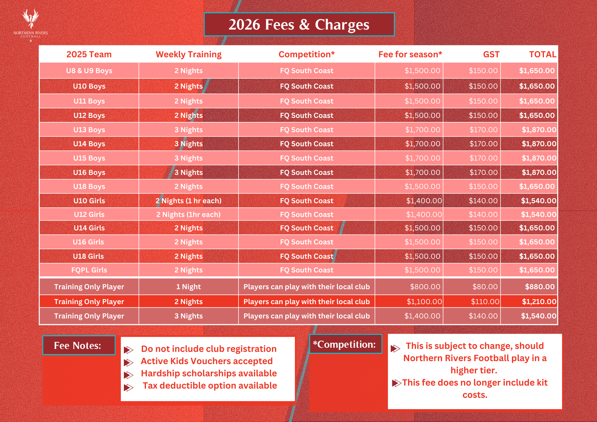 Find detailed information about our fees and charges for the 2026 season. Our fee structure includes options for both full-time squad players and training-only players. We also offer hardship scholarships and accept Active Kids Vouchers. Check out the full details to see what works best for your budget. 2026 Fees & Charges - Click Here